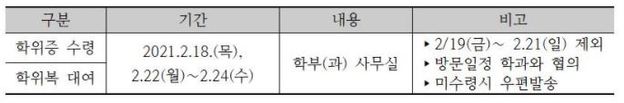 HOME > 학과공지 > 2020학년도 전기(제 24회) 학위수여식 취소에 따른 안내 알림학과공지 학과공지 2020학년도 전기(제 24회) 학위수여식 취소에 따른 안내 코로나 19로 인해 사회적 거리두기가 지속적으로 시행되고 있어 지역사회 확산 방지를 위하여 [2020학년도 전기(제 24회)학위수여식]이 취소되었습니다. 학부모님과 졸업생 여러분들의 양해를 부탁드리며 학위증 수령과 학위복 대여에 대하여 다음과 같이 안내하드립니다. ■ 학위증 수령 및 학위복 대여 안내 ■ 문의안내 목록보기