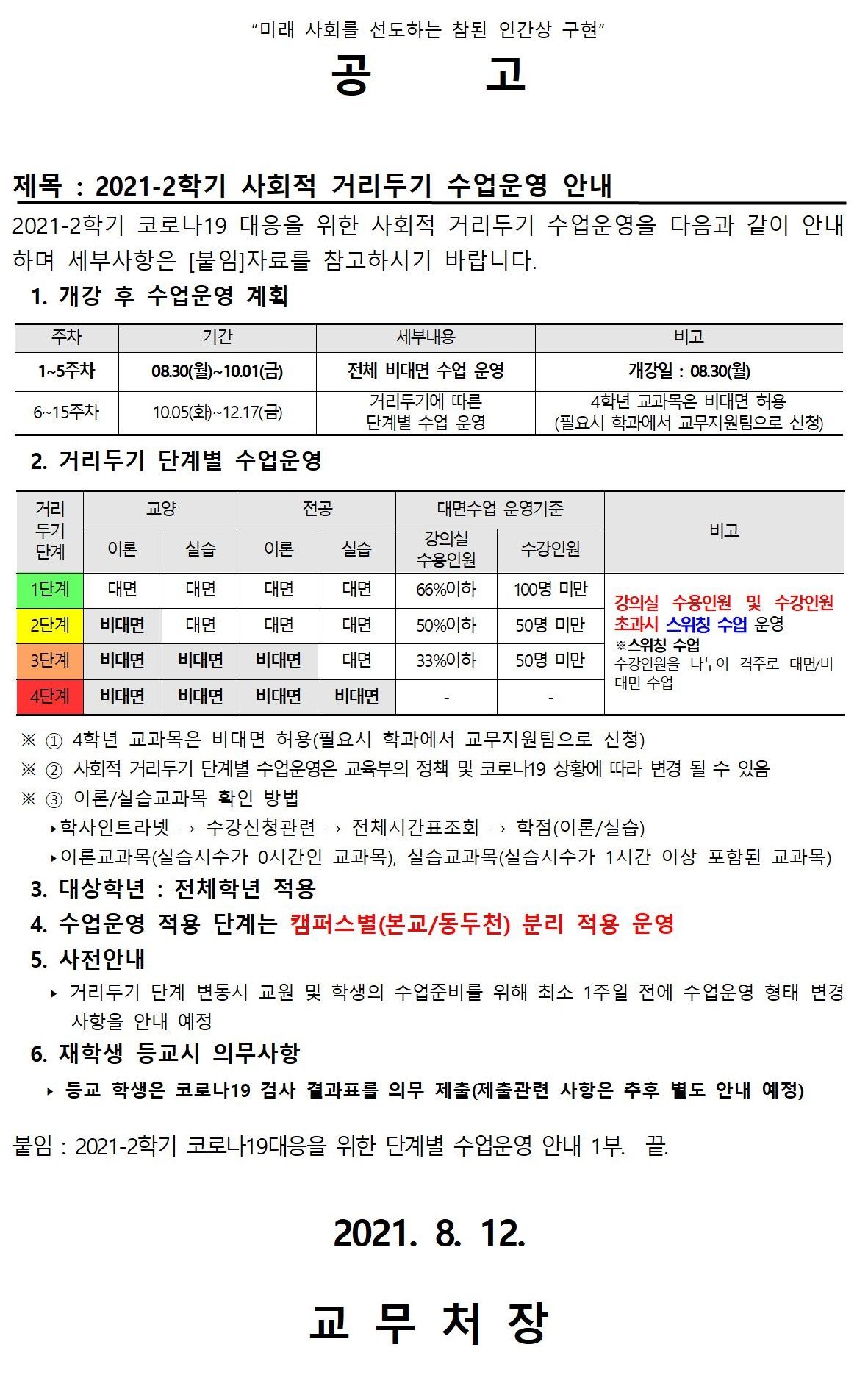 2021-2학기 사회적 거리두기 수업 운영 안내